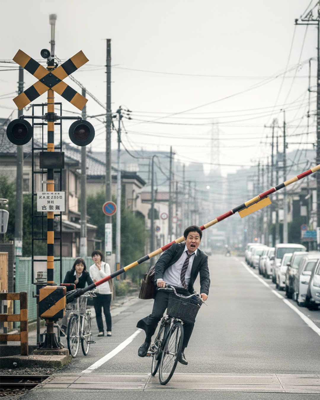 遮断機が「下りかけている」踏切を自転車でスッと通過。